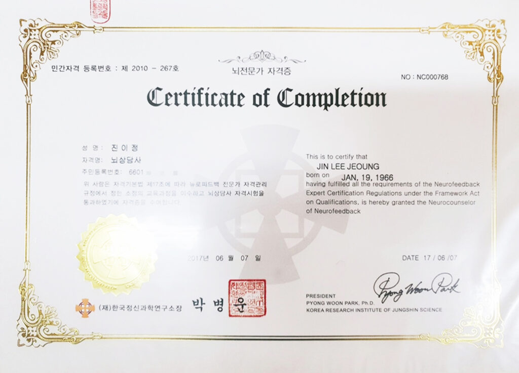 공인된 전문 교육과 자격 과정을 이수하여, 뇌파 훈련 및 정서·인지 상담을 보다 체계적이고 안전하게 제공합니다.